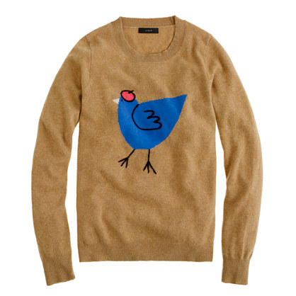 After disliking it for years, I have been on a J Crew binge during their summer and winter sales. I like the pencil skirts in suiting fabrics–other pencils are pretty but do not drape, cardigans w/ a belt, and collared shirts ( shocker b/ c I don’t even like collars). And I am ridiculously drawn to the whimsy. My daughters talked me out of buying plaid capri pants last year, and I talked myself out of getting the heart cashmere sweater (I am such a non-heart-on-clothes person, but I loved it.) And the poule above really is too childlike, but in my mind, I’m still giving it a narrow berth. I think it’s the simplicity of the designs plus the bright colors. And the quality really has improved greatly.