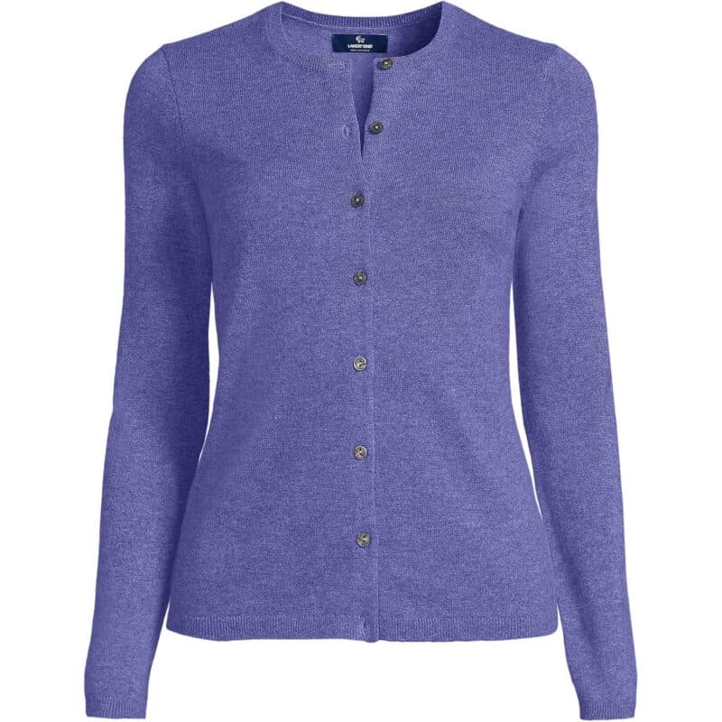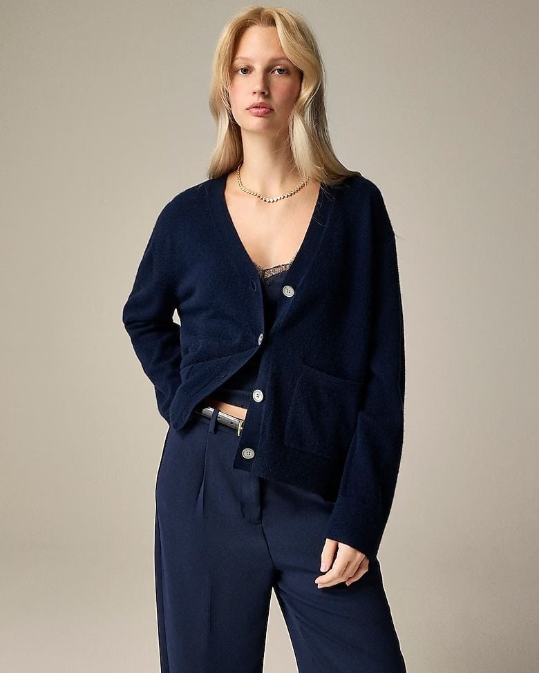 I’ve always found Lands’ End cashmere pieces to be very good quality. This classic cardigan is available in Regular, Petite, Tall and Plus sizes. If you’re looking for an alternative to cropped styles, this one hits at mid-hip.