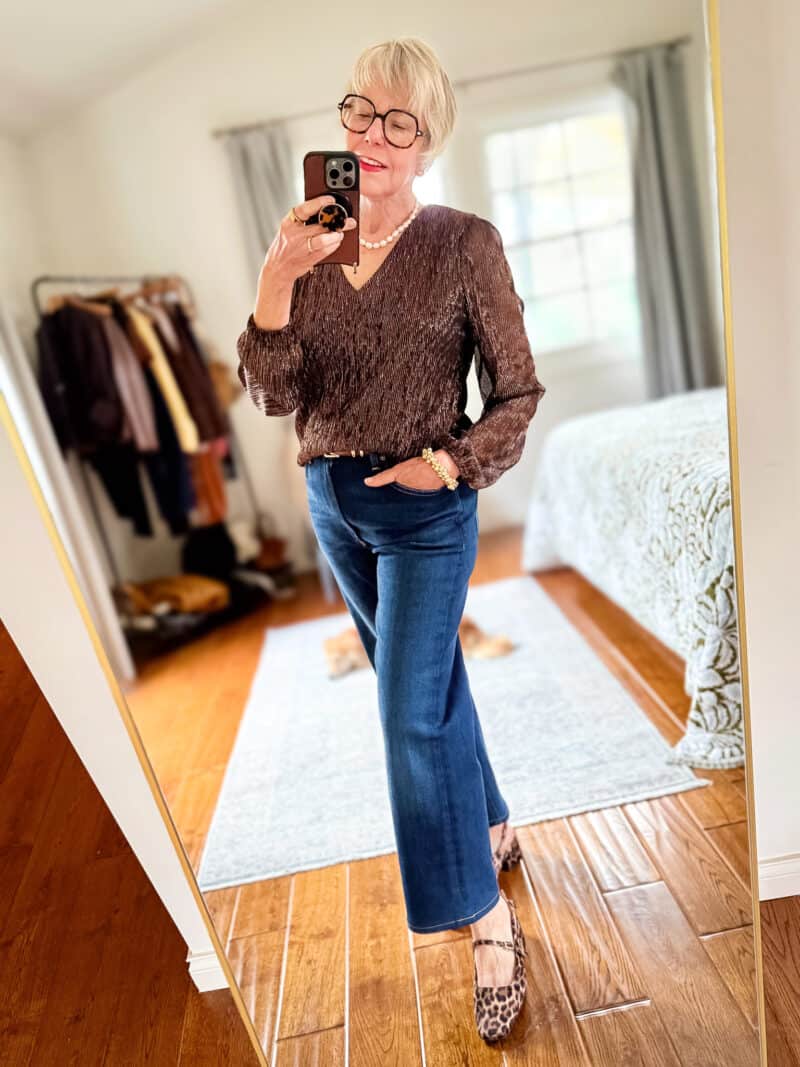 Holiday looks don’t have to be complicated! Here I’ve paired a shimmery plissé top with straight leg jeans, then added a short pearl necklace, fun bracelet, and leopard print slingback shoes. It’s an easy formula: one festive top, one polished accessory, one patterned shoe.