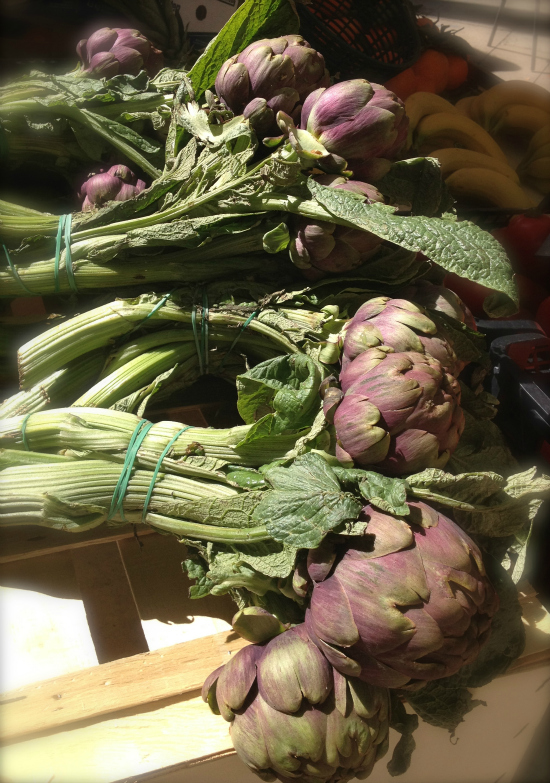 Ever since seeing these gorgeous purple artichokes at the farmer’s market in Aix-en-Provence last year, I’ve been on the lookout for similar artichokes here.
