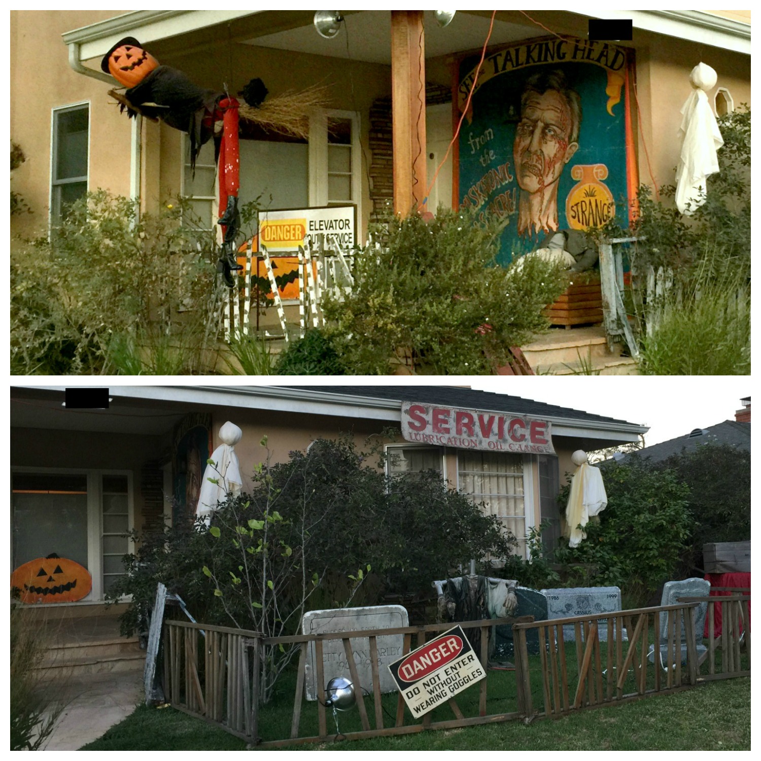 Our neighborhood is a Trick Or Treat Destination, and many of our neighbors really get into decorating. Wednesday night’s crazy Santa Ana winds played havoc with some of the yard decor I’d planned to photograph yesterday, but did manage to find these two yards intact while out walking the dogs early in the morning.