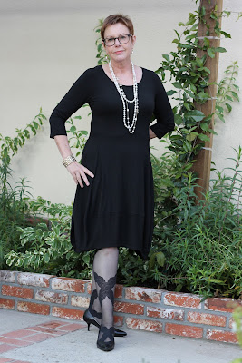 The tights are fun, though I prefer the smaller patterns. Love the Eileen Fisher black dress. It was sold out in my size before I made the decision to purchase; glad you were able to snag one.