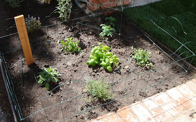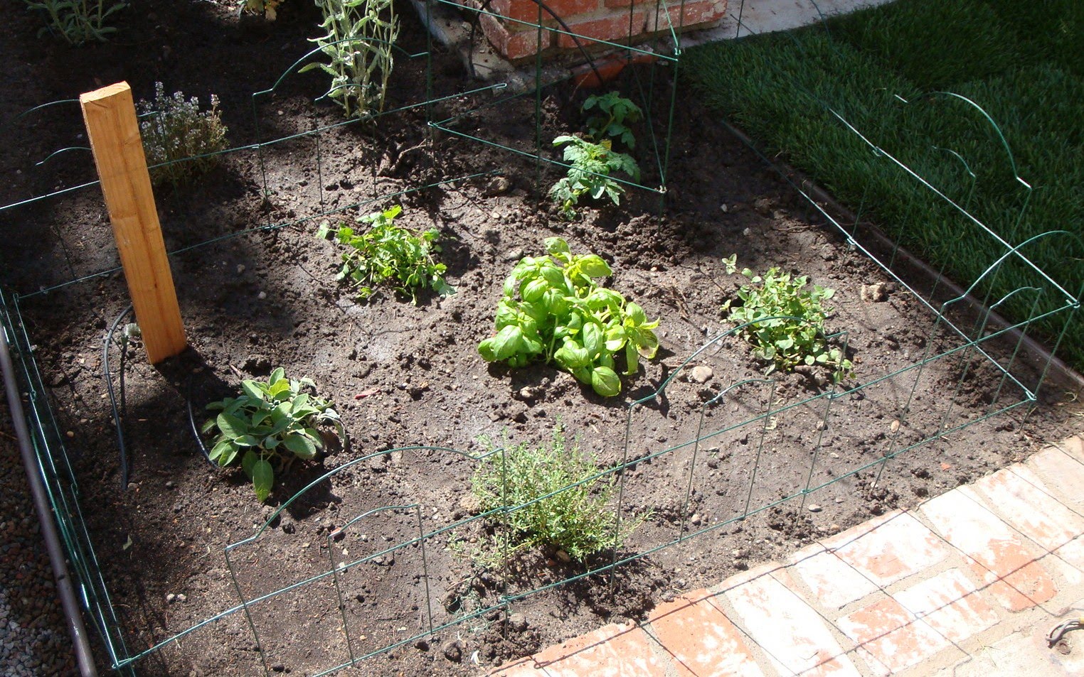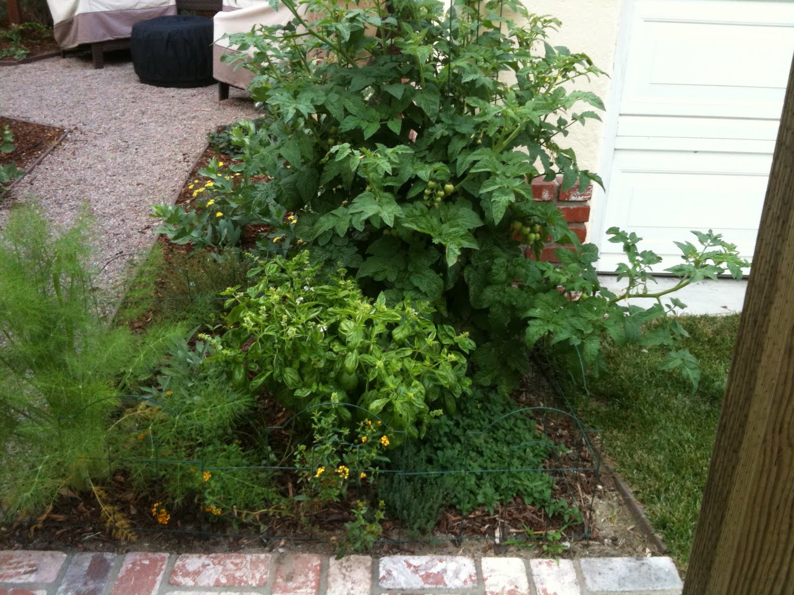 Here’s a shot of the herb/tomato garden as it looked when I planted back in the beginning of June: