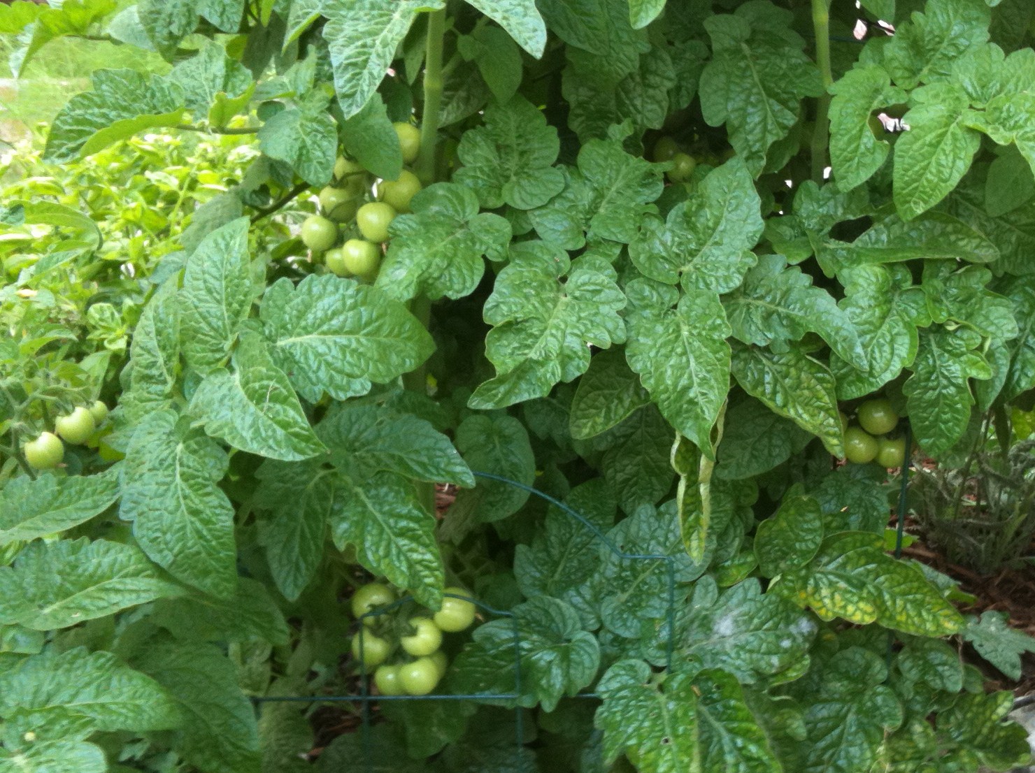 Even with the preponderance of cool and cloudy weather we’ve had this summer, my cherry tomato plant seems quite happy and is preparing some nice gifts: