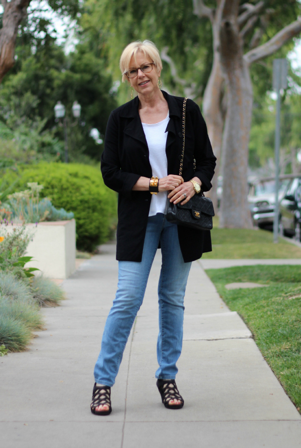 This is one of those outfits that hits my Style Sweet Spotâ„¢. I’m just crazy for these light wash jeans. They’re very comfortable, and work nicely to balance out darker neutrals. While we’re just a few days from the official beginning of Summer, evenings are still cool enough that I need a jacket.