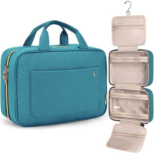 This lightweight toiletries kit holds a surprising amount, yet folds up compactly. It’s perfect for bathrooms with limited counter space! The clear plastic compartments make it easy to find what you need!