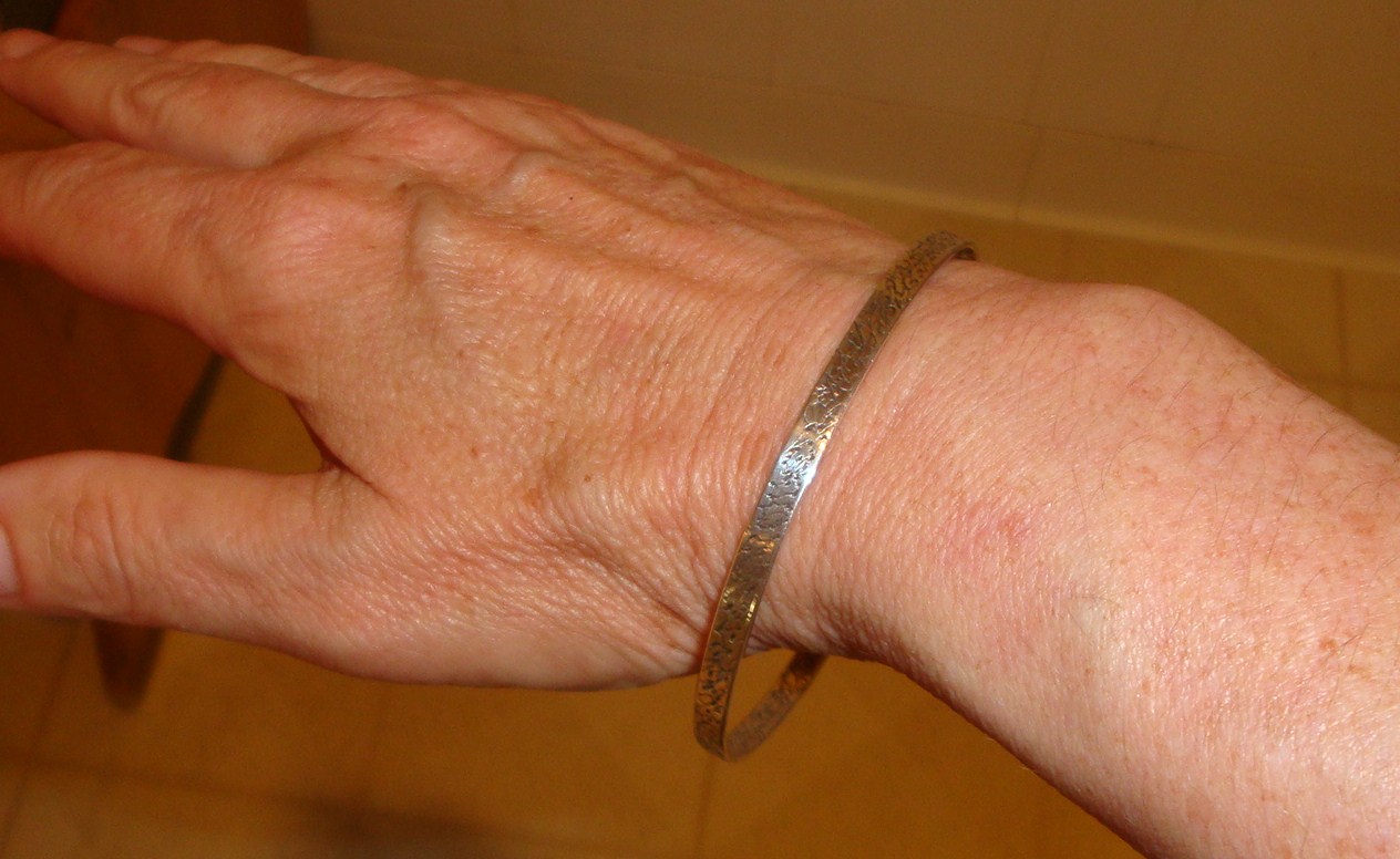 Then you raise your arm — casting a fond look at how the bangle glows in the light — in order to pass off the lotion to your husband, whose hands are a bit calloused from recent weed pulling?