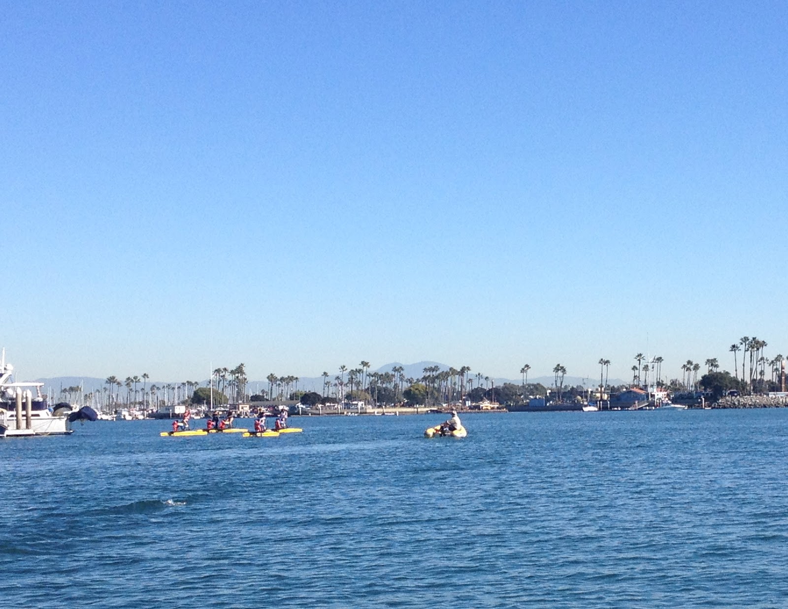 | Kayakers near Naples area of Long Beach. One doesn’t often see those distant mountains or skies this blue. |