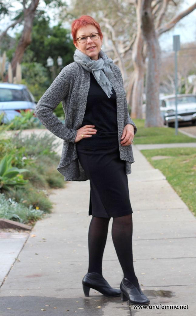 Gray really suits your color. That red hair…wow! And you can’t go wrong with anything from Eileen Fisher, one of my favorite sources for classic clothes. I usually go for a slightly larger size, too, as I like the extra comfort. Anything clingy just makes me squirm.