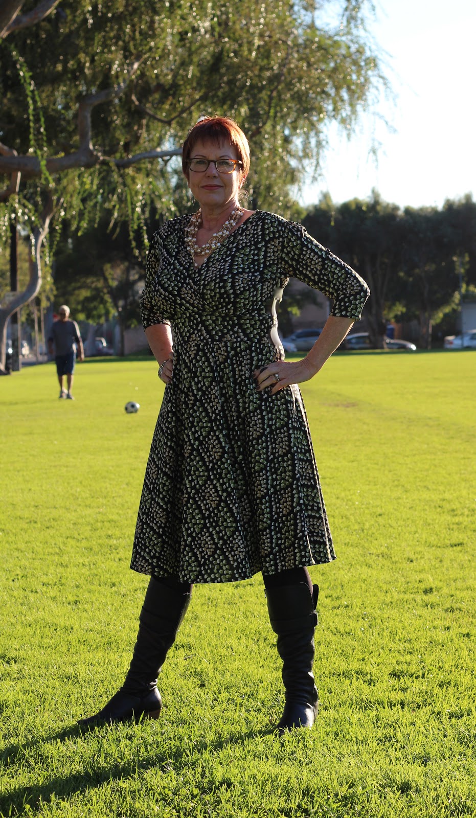 The Karina Dresses “Megan” style (above) works well with my shape. The modified empire cut of the dress creates a bit of a waistline, the 3/4 sleeves are my favorite length, and the fabric stretches and moves with me and is so comfortable that I’ll keep it on even after I get home from work. The Arche “swashbuckler” boots were purchased in Paris in 2009, and I love the panache they add. (And they are walk-all-day comfortable!) I feel like I can really move in this outfit, which I love.