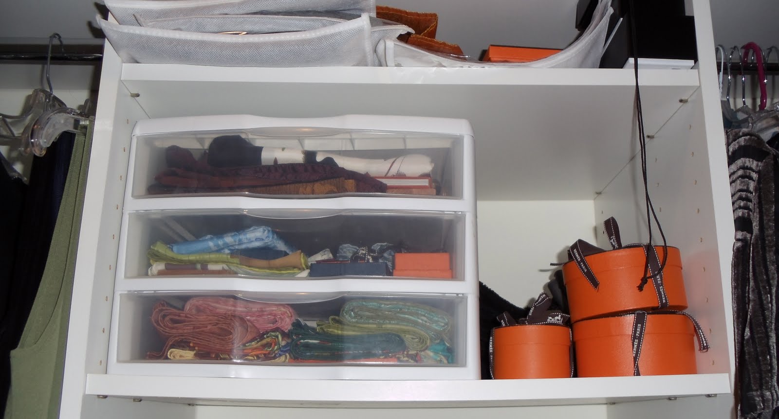 What a great way to store silk scarves! I have two deep drawers where I stack my scarves and always have to plow through the whole pile to find what I want. I am heading out right now to Home Depot to get some clear boxes.