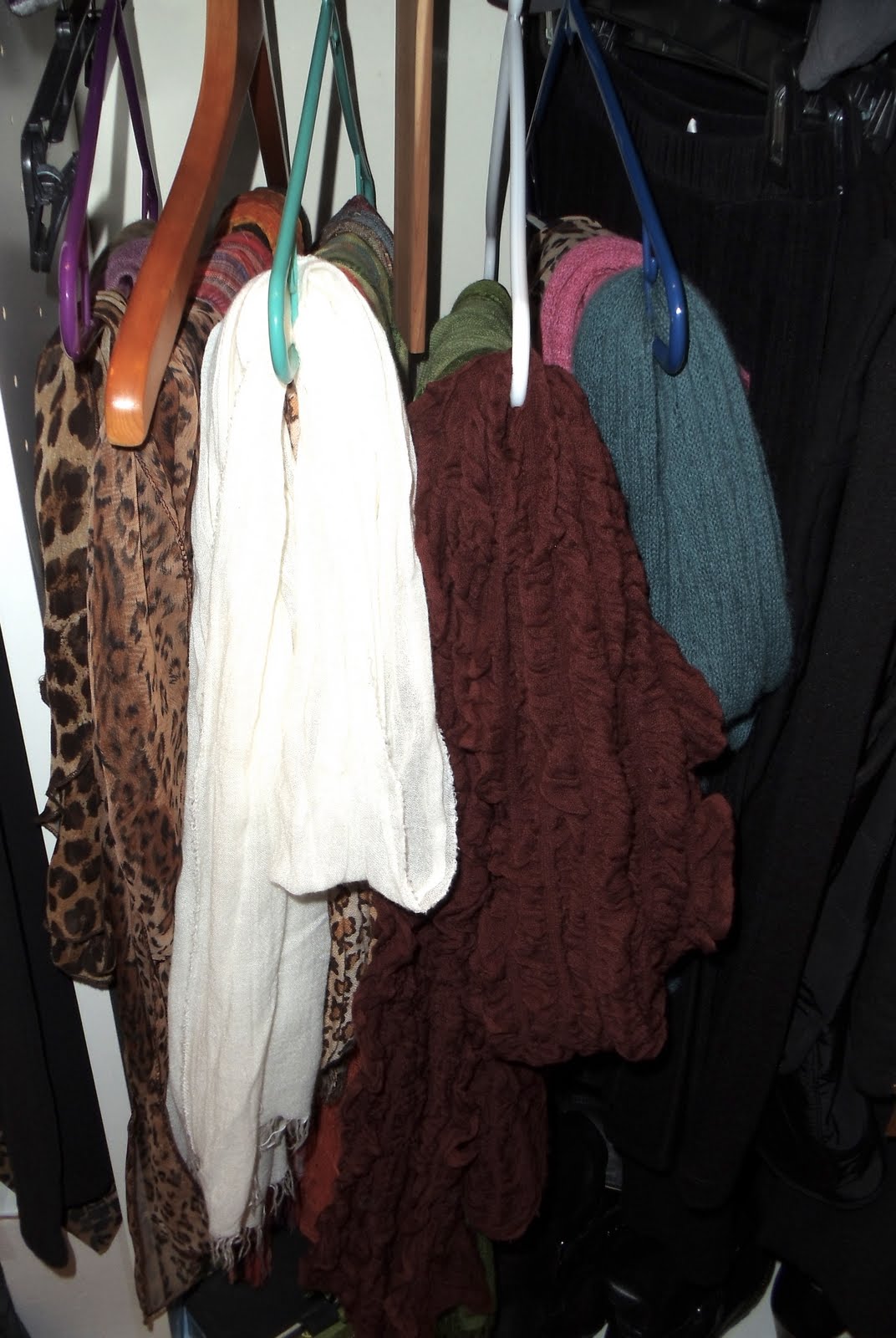 That’s a cedar block hanging middle top of the picture to keep moths away. Watch out for sharp edges on hangers which can snag scarves. Â I probably should replace the rest of those plastic ones with wood.