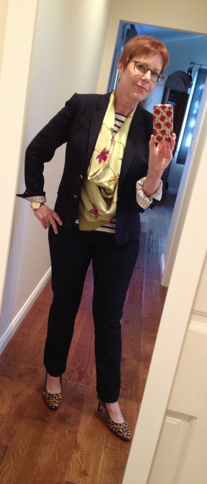 Love your yellow scarf with your navy suit. Nice match!