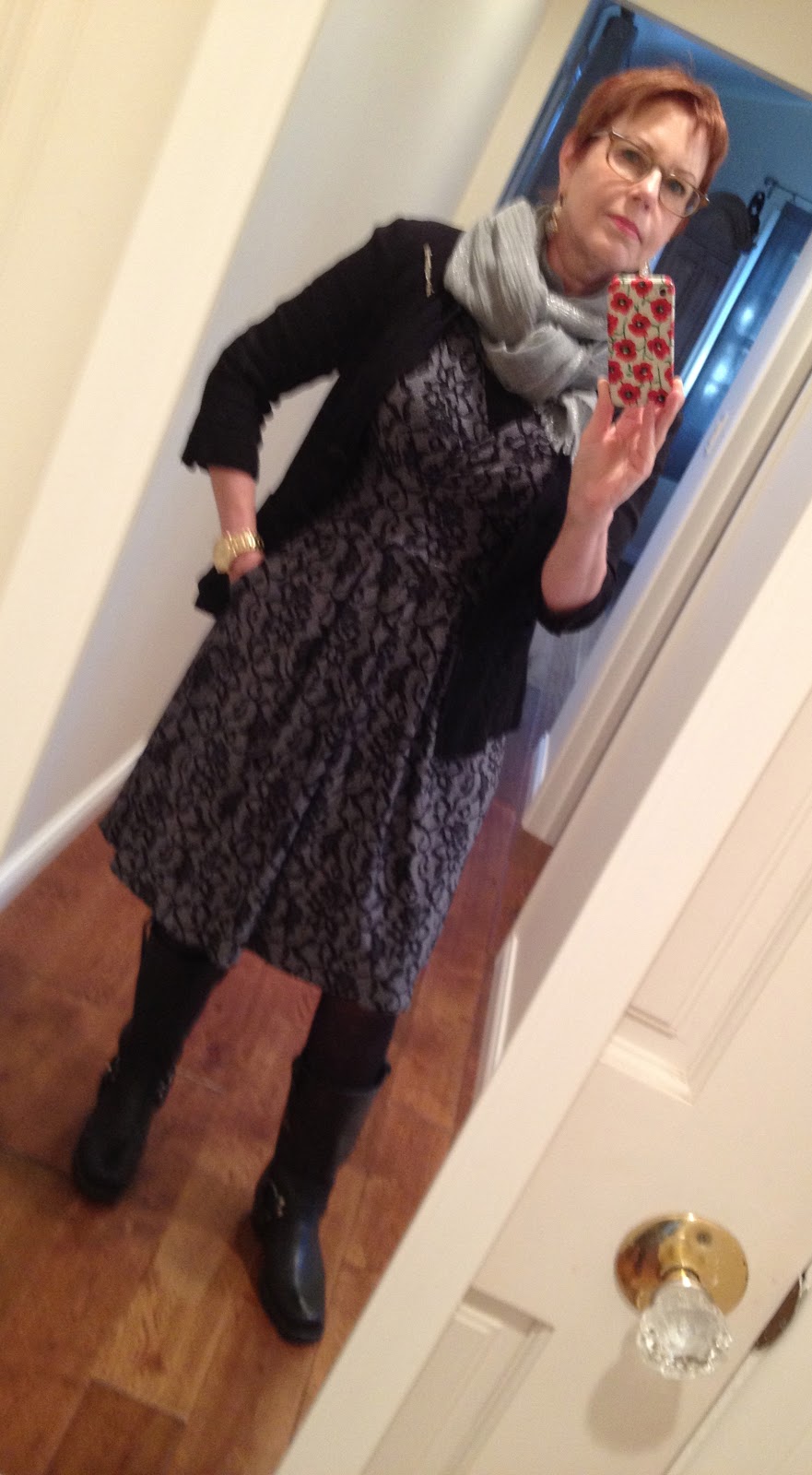 Dress ‘n boots combo is wonderful, and so is the second outfit. I too have adopted a uniform of a indigo Tahari “blazer” — which is really a blazer front with a stretchy jersey back — and jeans. And when I’m not wearing that, I’m in a dress and boots!