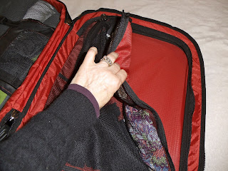 Above, all the clothing is now packed and secured using the compression straps to keep everything in place. Underwear and bras are in the mesh compartments in the lid on the right. Â I still have room in the main compartment for my electrical equipment (various chargers and an adapter) if I want.