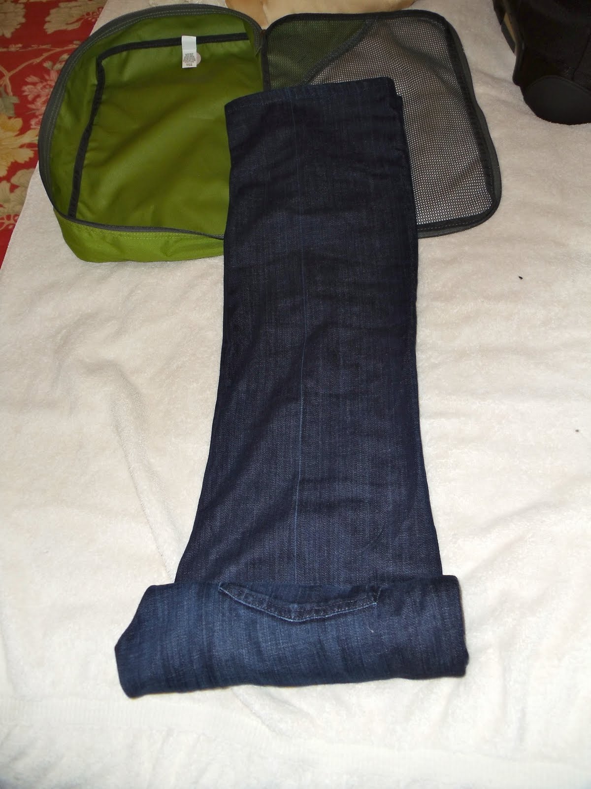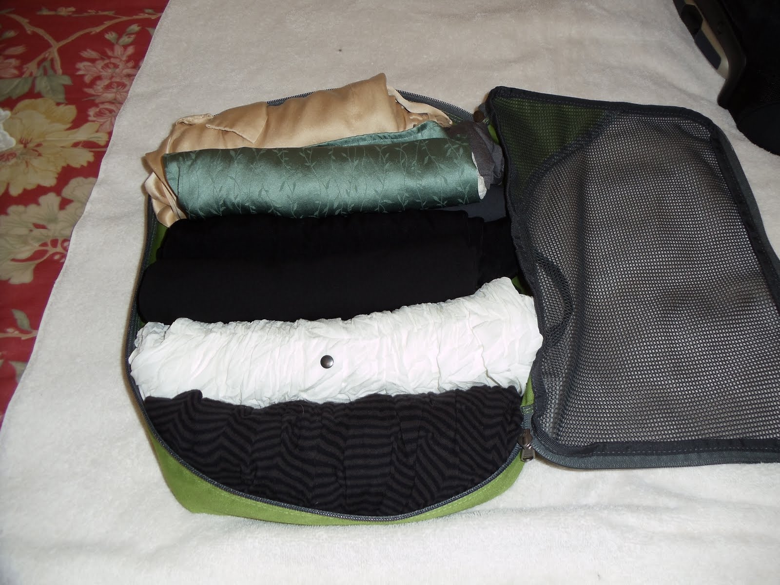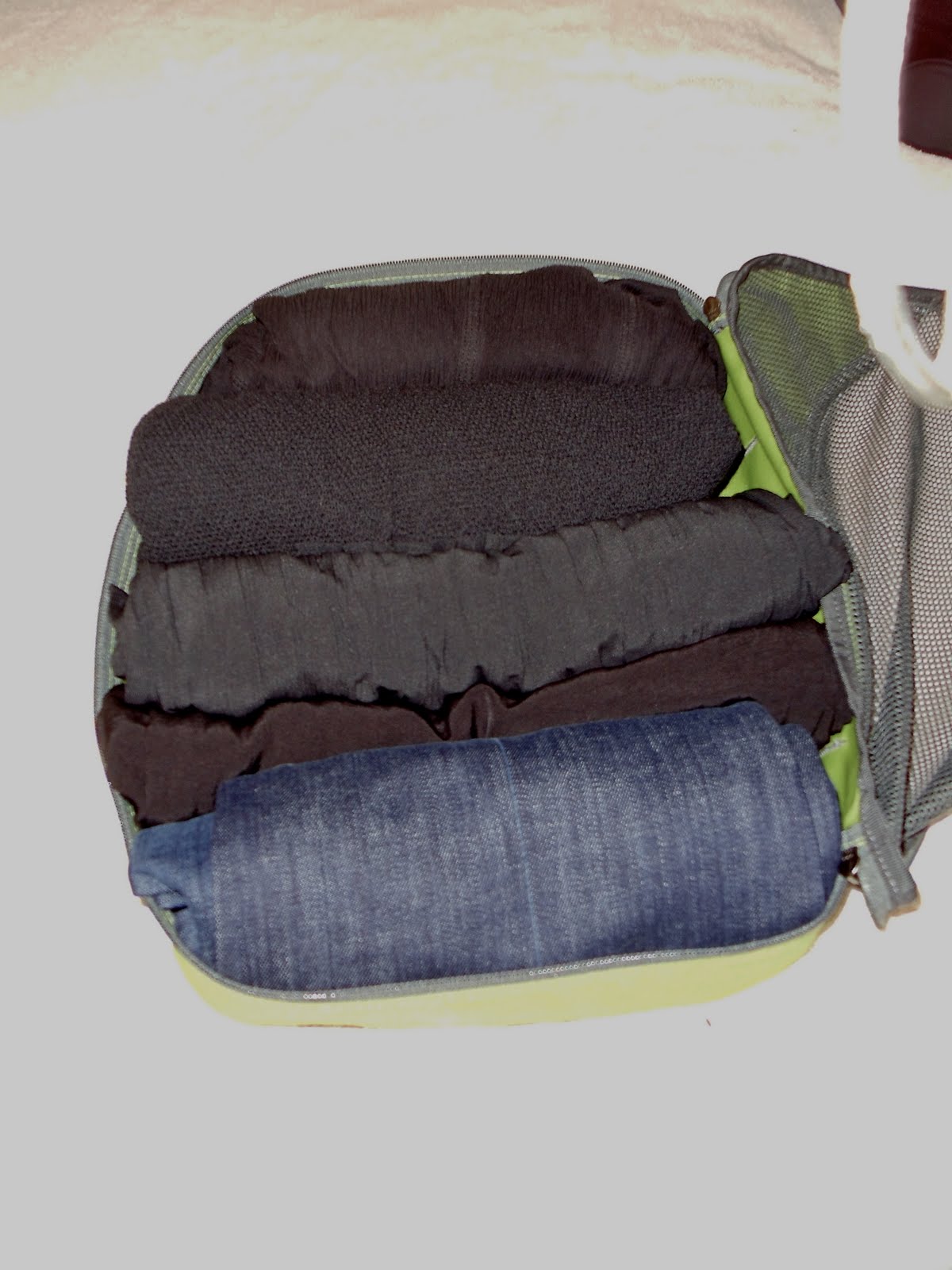 In the first packing cube above, I was able to fit the three pair of pants that I’m packing plus the long black cardigan and short jacket, all rolled.