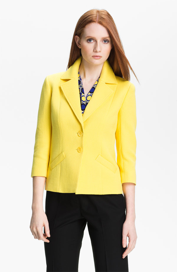 I find that lightweight jackets are indispensable for the office in warmer months. Throw on a jacket over a tee and simple pair of cotton pants and you’re meeting-ready. Office air conditioner on overdrive? A cotton or silk knit jacket is just enough to balance outdoor and indoor temperatures. But those lightweight knit jackets have been elusive creatures in past seasons, especially in colors other than black, so I’ve been thrilled to see more offerings with this year’s Resort and Spring collections.