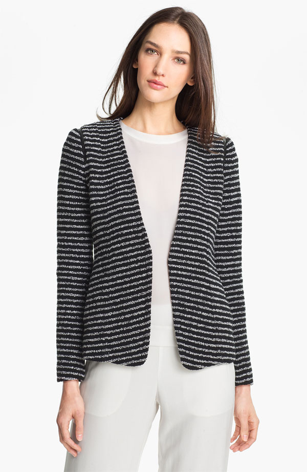 This cotton/polyester jacket from Theory is lined, so may be too warm for the height of summer but the slightly angled stripes are fun and a nice change from a solid blazer. It looks to be a bit shaped as well, more flattering for many of us than very boxy styles.
