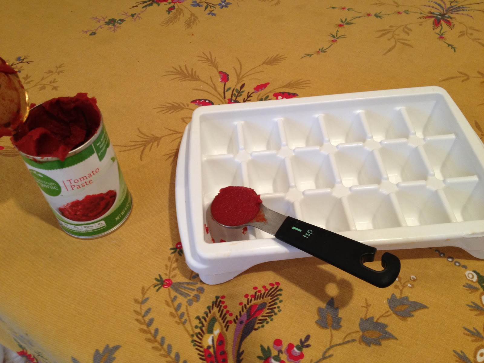 Figure out what measurement will fill each of the “cubes.” This tray holds a perfect 2 teaspoons. Using a spoon and a small rubber spatula, scoop out the remaining tomato paste and fill as many cubes as you have paste.