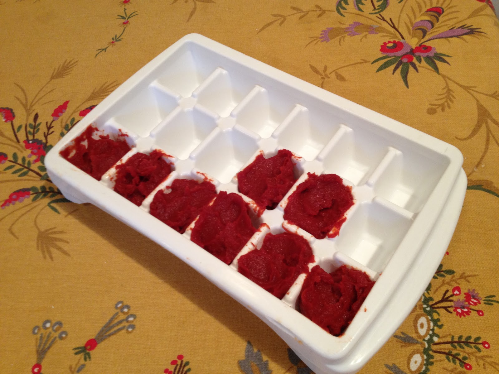 No need to dirty (and stain) an ice cube tray. I just plop approximately tablespoon-sized blobs onto a piece of waxed paper, and slide that into the freezer. Once frozen, I transfer the blobs to plastic freezer bags.
